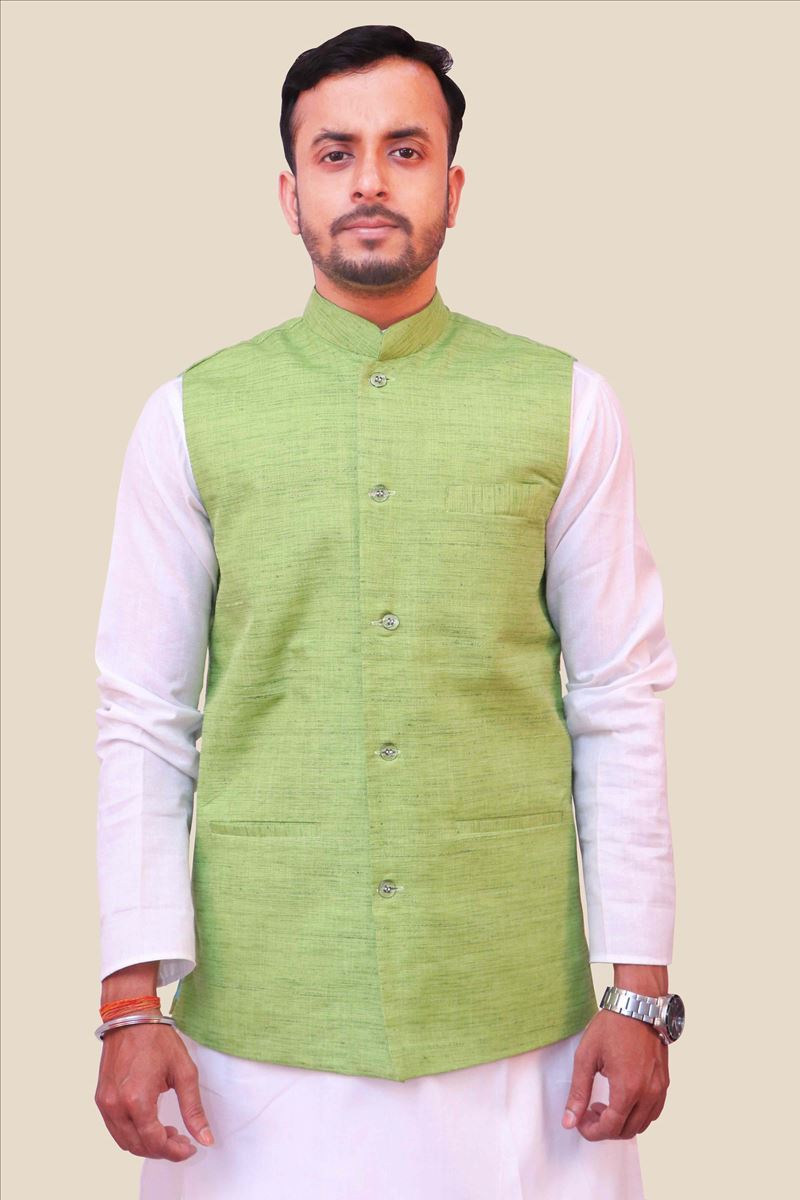 - Product details- This Solid Green Khadi Nehru Bandi has a full button placket & will be a perfect addition to your wardrobe. Shop now and experience ultimate Style and Comfort.